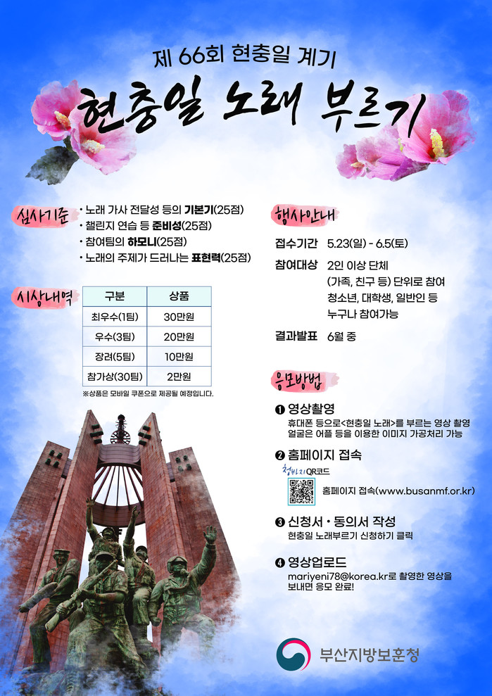 지난 3. 1. ‘삼일절 노래’ 팀 챌린지에 이어 다가오는 6. 6. 현충일을 계기로 ‘현충일 노래’부르기 챌린지 이벤트를 오는 5월 23일(일)부터 6월 5일(토)진행하며, 청소년, 대학생, 일반인 등 2인 이상의 단체는 누구나 참여 가능하다.