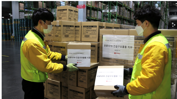| ▲ 아성다이소 직원들이 대구광역시에 지원할 KF94 마스크를 운반하고 있다.(사진제공=다이소) |
