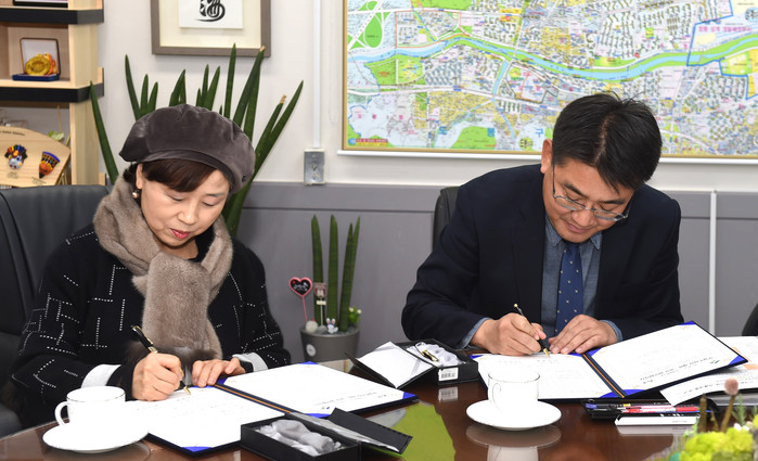 서울 노원구는 지난 11일 구청장실에서 상계중학교와 주차장 개방 협약을 체결했다. 협약기간은 오는 2021년 12월10일까지다. 사진은 이날 열린 협약식에서 오승록 구청장(오른쪽)과 학교 교장이 협약서에 서명을 하고 있는 모습.(사진제공=노원구청)