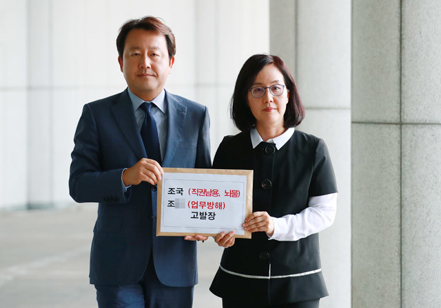 자유한국당 김현아 의원(오른쪽)과 김용남 전 의원이 22일 오후 서울 서초구 대검찰청에서 조국 법무부 장관 후보자와 후보자의 딸 조 모씨를 직권남용죄 및 뇌물죄 등의 혐의로 고발하기 위해 종합민원실로 들어가고 있다.