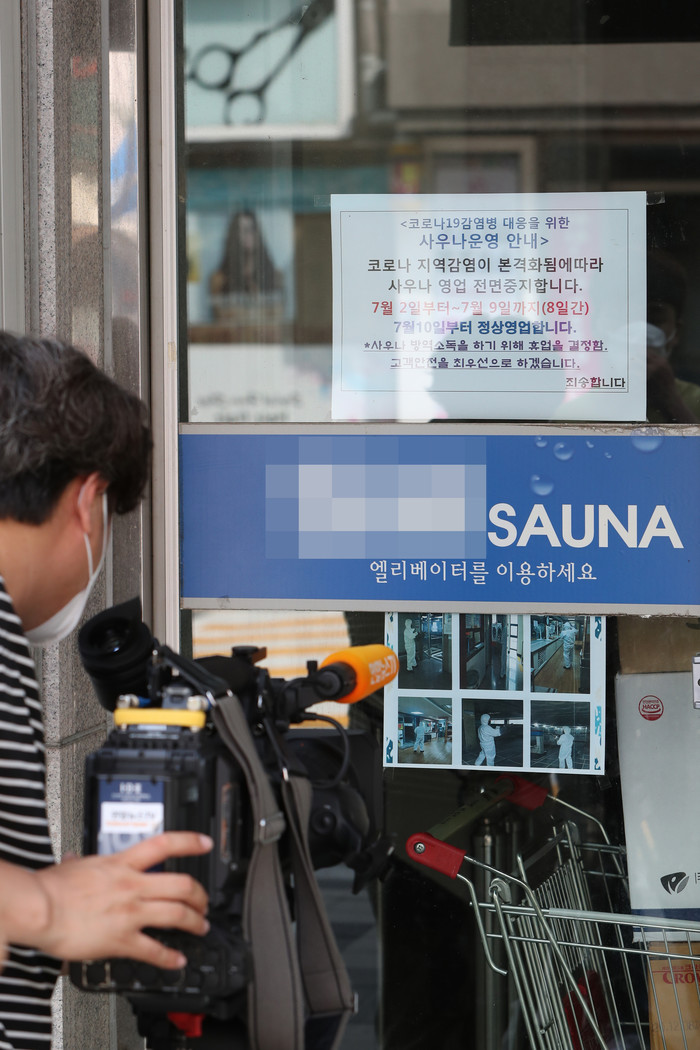 7일 오후 광주 광산구 신창동 SM사우나 출입문에 코로나19로 인한 시설폐쇄 행정명령 처분서가 붙어 있다. 시는 이 사우나에서 근무하는 3명이 확진 판정을 받아 방문자를 대상으로 진단검사에 나섰다.
