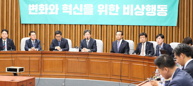 바른미래당 내 비당권파 모임 ‘변화와 혁신을 위한 행동’(변혁) 대표인 유승민 의원(왼쪽 네번째)이 29일 오전 국회에서 열린 국회의원-지역위원장(원외) 연석회의에서 발언하고 있다. /연합뉴스