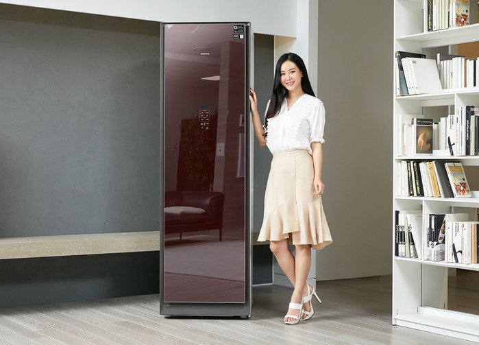 | ▲ 삼성전자 모델이 수원 삼성전자 디지털시티 프리미엄하우스에서 의류청정기 '에어드레서' 신규 색상인 '버건디 미러'를 소개하고 있다.(사진제공=삼성전자) |