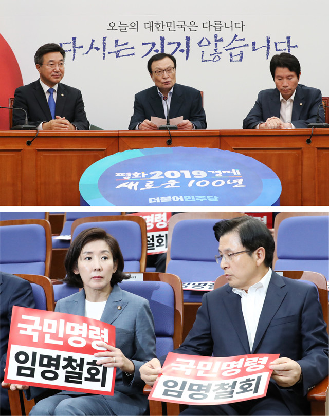 더불어민주당 이해찬 대표가 9일 오후 국회 당 대표 회의실에서 열린 고위전략회의에서 발언하고 있다(위). 자유한국당 황교안 대표와 나경원 원내대표가 9일 오후 국회에서 열린 긴급의원총회에 참석해 있다. /연합뉴스