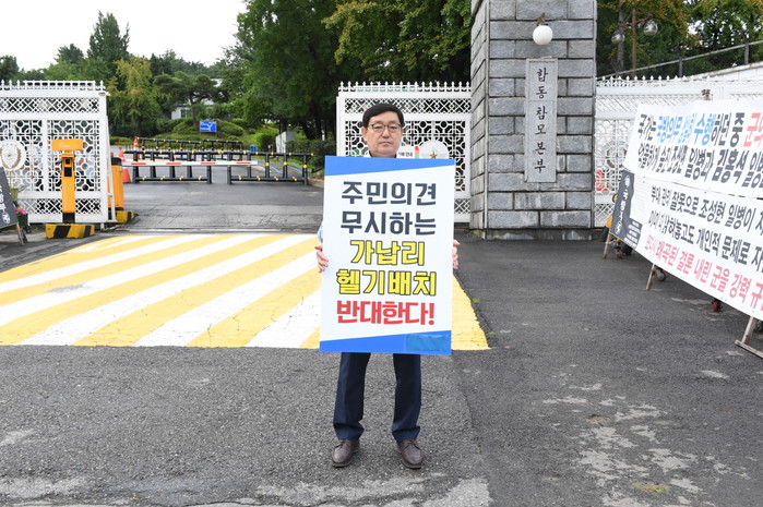 [수원=채종수 기자] 경기도의회 도시환경위원회 박재만 위원장(더불어민주당·양주)은 최근 서울 용산구 국방부 앞에서 양주시 가납리 비행장에 대한 헬기부대 이전 계획 철회를 촉구하는 1인 시위를 펼쳤다.