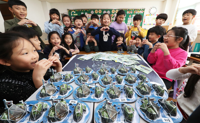 독도의 날을 하루 앞둔 24일 오후 경기도 수원시 장안구 율전초등학교에서 2학년 학생들이 직접 만든 독도 모형을 보여주고 있다.