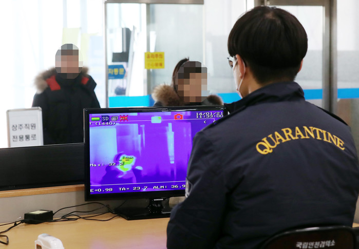 중국에서 원인불명의 폐렴이 발생해 우리나라 검역당국의 검역이 강화된 14일 오전 인천시 중구 인천항 제1국제여객터미널에서 국립인천검역소 관계자들이 국내로 입국한 중국 관광객들의 체온을 발열감지카메라로 살피고 있다.