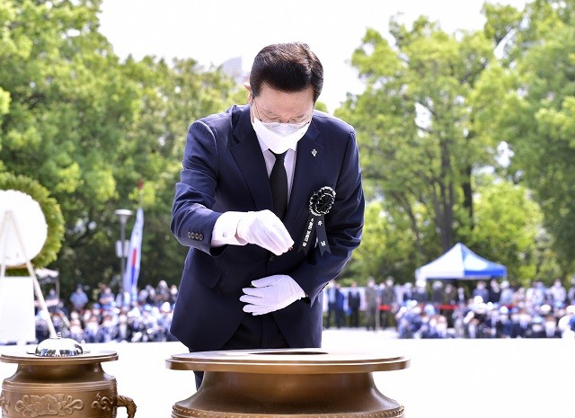 | ▲ 이용섭 광주광역시장이 6일 오전 남구 광주공원 현충탑에서 열린 '제66회 현충일 추념식'에 참석해 헌화와 분향을 하고 있다./광주광역시 제공 |