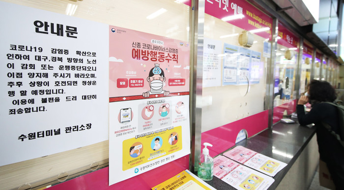 26일 오후 경기도 수원버스터미널에 코로나19(우한폐렴) 확산으로 인한 대구·경북 방향 버스 감회·운행 중단 안내문이 붙어 있다.