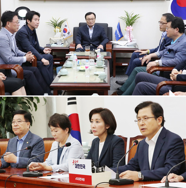 8일 오후 국회에서 열린 더불어민주당 최고위원회의에 이해찬 대표와 이인영 원내대표 등 참석자들이 굳은 표정으로 참석해 있다(위). 자유한국당 황교안 대표는 8일 국회에서 열린 긴급 최고위원회의에서 “만약 문재인 대통령이 피의자 조국에 대한 법무부 장관 임명을 강행한다면 바로 그날이 문재인 정권 종말의 시작이 될 것”이라고 말했다.