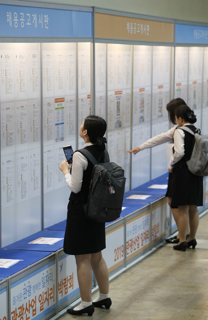 29일 오전 서울 강남구 코엑스에서 열린 '2019 관광산업 일자리 박람회'에서 구직자들이 채용공고 게시판을 살펴보고 있다.