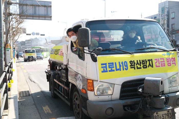 서울 관악구는 코로나19 확산에 따라 3.5톤 살수 차량 2대를 투입해 버스정류장, 지하철역 입구, 전통시장, 주택가 등을 대상으로 이동식 방역을 하고 있다. 사진은 박준희 구청장이 살수차량을 타고 방역상황을 점검하고 있는 모습.(사진제공=관악구청)