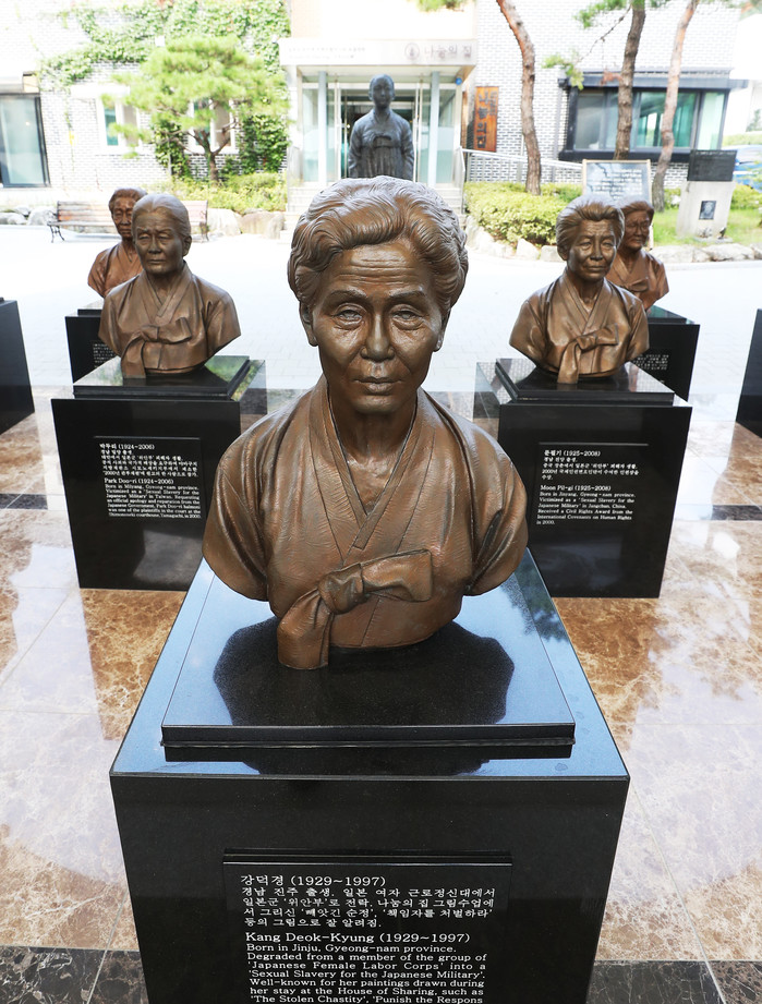 세계 일본군 위안부 피해자 기림일을 하루 앞둔 13일 오후 경기도 광주시 퇴촌면 나눔의 집에 고인이 된 할머니들의 흉상이 세워져 있다.