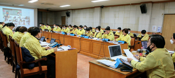 5일 인천 미추홀구가 코로나19 확산방지대책을 위해 구청 전체 간부공무원과 함께 확대간부회의를 열고 인터넷 생방송으로 송출했다. 사진은 확대간부회의 모습.(사진제공=미추홀구청)