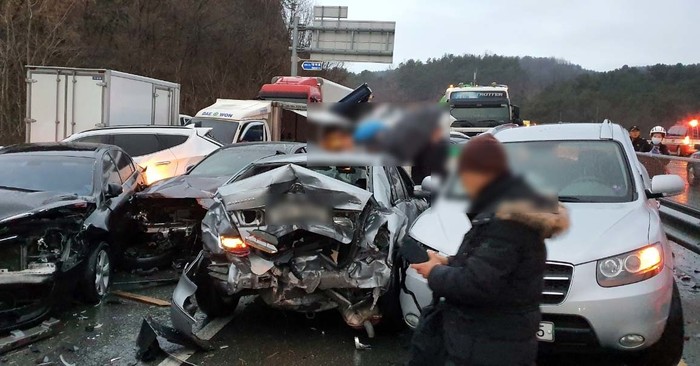6일 오전 경남 합천군 대양면 한 도로에서 승용차, 트럭 등 40여 대가 추돌하는 사고가 발생해 차량 운전자들이 도로 위에 나와 있다.