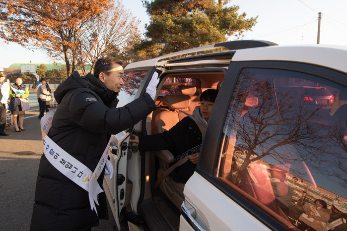 경기 여주시가 12일 여흥초등학교에서 이항진 시장을 비롯한 여주경찰서, 시청, 녹색어머니엽합회, 여흥초 관계자 등 70여명이 참여한 가운데 스쿨존내 교통사고 예방 캠페인을 펼쳤다. 사진은 이 시장이 학부모 및 학생에게 교통법규 준수를 당부하는 모습. (사진제공=여주시청)
