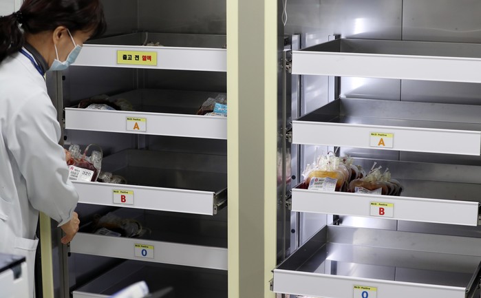 신종 코로나바이러스 감염증에 대한 우려가 커지며 시민들이 헌혈을 기피해 혈액 수급에 빨간불이 켜졌다. 4일 대구 시내 한 대학병원 혈액 보관창고가 텅 비어 있다. 대한적십자사 혈액 관리본부에 따르면 이날 오전 11시 기준 전국 평균 혈액 보유량은 2.7일분을 기록했다.