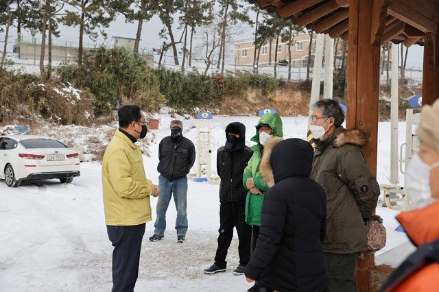 | ▲ 명현관 해남군수(좌측)가 지난 7일 해남지역에 내린 폭설로 정전된 화원면 서북마을인 올래, 매개, 온덕리 3개 마을을 10일 방문해 피해상황을 점검하고 주민들에게 재발방지 대책 설명과 함께 위로를 전하고 있다. / 해남군 제공 |