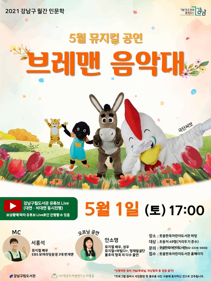 이번 공연은 강남구에서 매월 개최하는 ‘주제가 있는 월간 인문학’ 5월 행사의 일환으로 진행되며, 어린이들이 좋아하는 도서 '브레맨 음악대'를 극단 ‘씨앗’에서 뮤지컬 공연으로 펼친다.