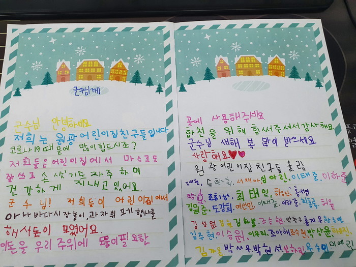원생들의 손편지에는 ‘어린이집에서 아나바다 시장, 과자뷔페 행사 등을 통해 돈을 모았어요. 이 돈을 우리 주위에 도움이 필요한 곳에 사용해주세요.’라고 적혀있다.