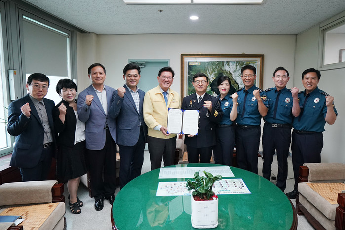 서울 동대문구가 최근 동대문경찰서와 ‘구·동 민원실의 안전한 근무환경 조성을 위한 업무협약’을 체결해 민원실에서 발생하는 폭언·폭행·위협 등으로부터 민원 공무원과 방문 민원인 보호에 나섰다. 사진은 협약 후 기념촬영을 하고 있는 유덕열 구청장(왼쪽에서 다섯 번째)과 관계자들의 모습.(사진제공=동대문구청)