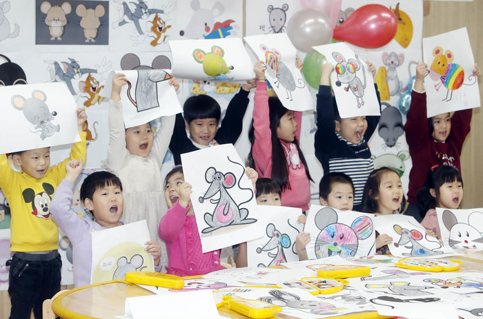2020년 경자년(庚子年) 새해를 이틀 앞둔 30일 오전 광주 북구청 직장어린이집에서 어린이들이 각양각색의 쥐 그림에 색칠하고 있다.