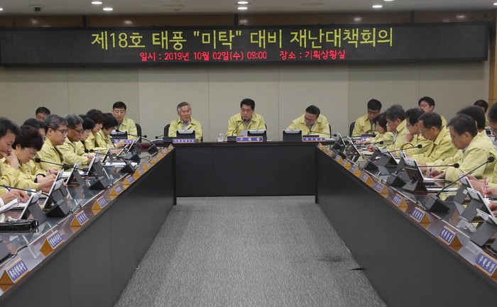 서울 관악구는 2일 구청 기획상황실에서 제18호 태풍 ‘미탁’ 북상에 대비해 안전관리를 강화하고 인명 및 재산 피해 예방에 만전을 기하고자 '긴급 점검회의'를 개최했다. 사진은 박준희 구청장(가운데)이 회의를 주재하는 모습.(사진제공=관악구청)