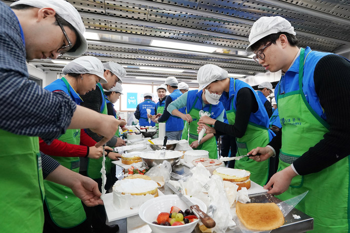 서울 동대문구가 최근 동대문구자원봉사센터(답십리1동 주민센터 4층)에서 ‘동아ST와 함께하는 사랑의 케이크 만들기 및 전달 봉사’ 행사를 개최, 생크림 케이크 100개를 만들고, 즉석밥·통조림 햄·양말 등 생필품 480세트를 포장했다. 사진은 직접 케이크를 만들고 있는 참가자들의 모습.(사진제공=동대문구)