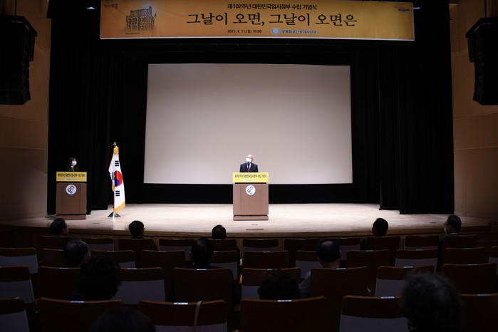 이 날 기념식에는 코로나19로 인해 애국지사 유족, 부산시 행정자치국장, 보훈단체장 등 100명 미만이 참석한 가운데 △국민의례 △대한민국 임시헌장 낭독 △기념사 △기념공연 △만세삼창 순으로 진행됐다.