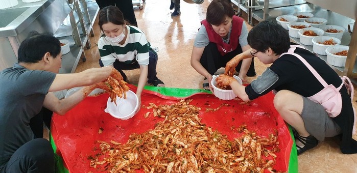 경기 동두천시 지원봉사센터 봉사단체 ‘맛있는 메아리’는 최근 아름다운문화센터 3층 쿠쿠홈에서 회원 10명과 배추김치, 깍두기 등의 계절김치를 담가 지역내 소외계층 50가구에 전달했다. 사진은 회원들이 김치를 용기에 담고 있는 모습.(사진제공=동두천시청)