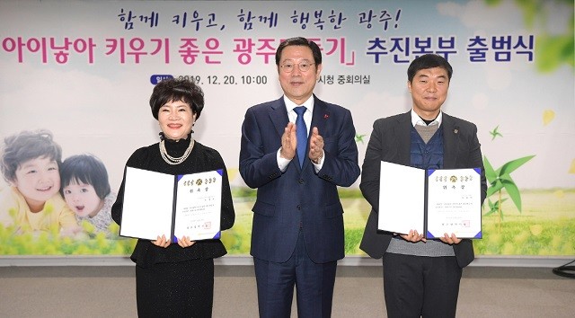 | 이용섭 광주광역시장이 20일 오전 시청 3층 중회의실에서 열린 ‘아이낳아 키우기 좋은광주만들기 추진본부 출범식’에 참석해 오경자 광주광역시 여성단체협의회장(왼쪽), 장형민 100인 아빠단 학부모(오른쪽)에게 대표로 위촉장을 수여한 후 기념촬영을 하고 있다./광주광역시 제공 |
