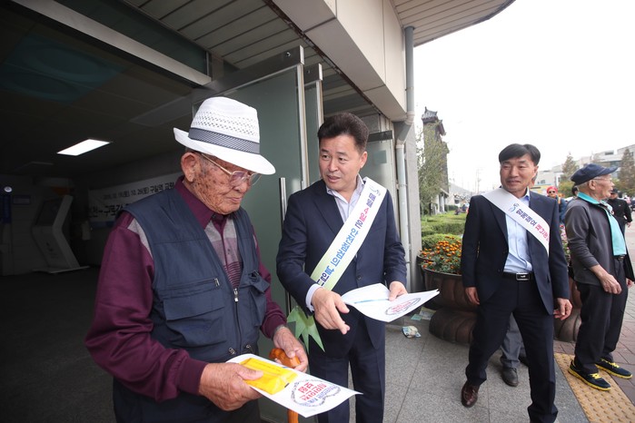 인천 동구는 최근 '제283차 안전점검의 날'을 맞이해 동인천역 북광장 일대를 중심으로 안전점검의 날 캠페인을 전개, 지진 발생시 행동요령 및 대피장소 찾는 방법 등을 안내했다. 사진은 허인환 구청장(왼쪽에서 두 번째)이 홍보물을 배포하는 모습.(사진제공=동구청)