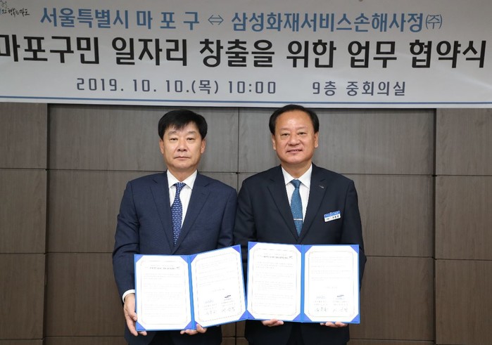 서울 마포구가 10일 구청에서 삼성화재서비스손해사정(주)과 구민 일자리 창출을 위한 업무협약을 체결했다. 이날 협약식에는 유동균 구청장을 비롯해 이상경 대표이사 등이 참석했다. 사진은 유 구청장(오른쪽)과 이 대표이사의 기념촬영 모습. (사진제공=마포구청)