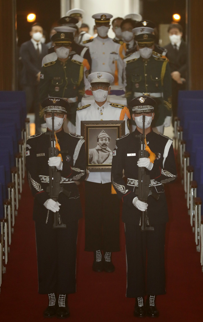 78년만에 고국 땅으로 돌아온 독립운동가 홍범도 장군의 유해가 15일 오후 국립대전현충원에 임시 안치되고 있다.