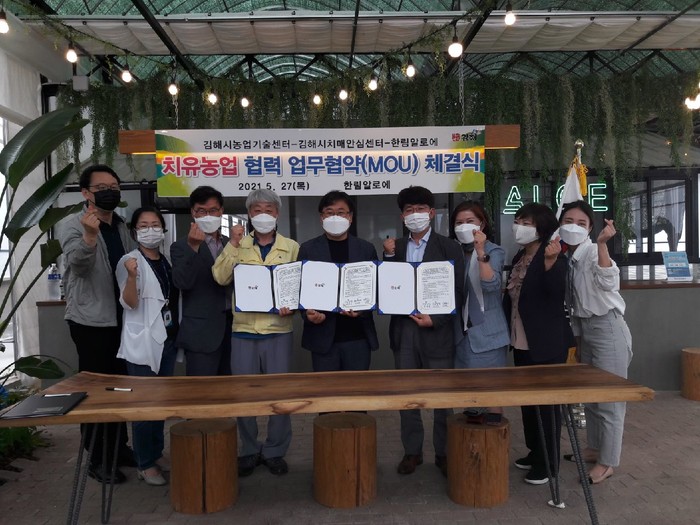 김해시는 27일 관내 치유농장인 ‘한림알로에(대표 허병문)’에서 김해시농업기술센터, 김해치매안심센터, 한림알로에 3자간 치매 예방과 치매환자 인지기능 강화를 위한 업무협약(MOU)을 체결한다고 밝혔다.
