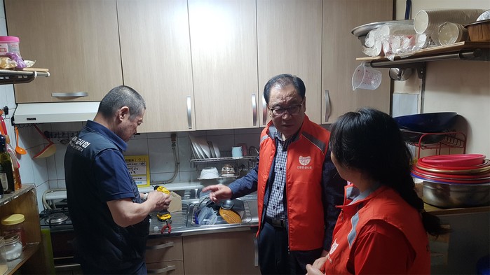 경기 이천시 신둔면 지역사회보장협의체는 최근 지역내 저소득 노인 또는 거동이 불편한 장애인가구 15곳에 가스안전을 위해 설정한 조리시간이 지나면 자동으로 가스 밸브가 잠기는 '가스 타이머콕'을 설치했다. 사진은 설치를 하는 모습.(사진제공=이천시청)