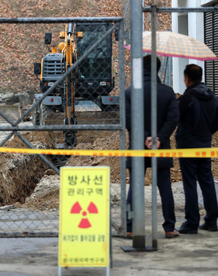 22일 오후 대전 한국원자력연구원 내 시설에서 한국원자력안전기술원(KINS) 사건조사팀이 방사성 물질 방출 원인을 조사하고 있다. 원자력안전위원회에 따르면 원자력연구원은 2019년 12월30일 연구원 정문 앞 하천 토양에서 시료를 채취했고, 지난 6일 이 시료에서 방사능 농도가 증가했음을 확인했다.