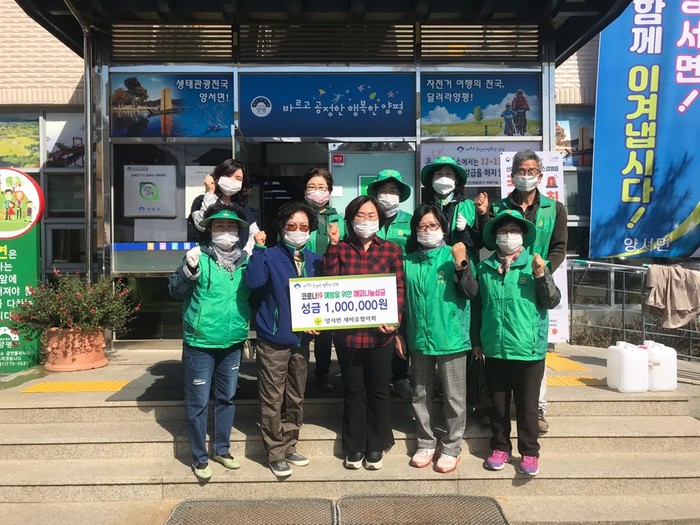 경기 양평군 양서면 새마을남녀협의회에서는 13일 코로나19의 확산 방지 및 피해 최소화를 위해 양서면사무소를 방문해 성금 100만원을 기탁했다. 사진은 기탁식에 참석한 관계자들이 기념촬영을 하는 모습.(사진제공=양평군청)