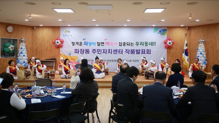 경기 수원시 장안구 파장동 주민자치위원회는 지난 18일 3층 대강당에서 시·도의원, 주민자치위원, 수강생, 주민 등이 참여한 가운데 ‘2019 주민자치센터 작품발표회’를 성황리에 개최했다. 사진은 참여자들이 국악공연을 선보이는 모습.(사진제공=장안구청)