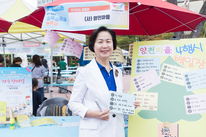 서울 양천구가 최근 파리공원에서 마을공동체사업 성과를 공유하고 마을사업에 대한 주민들의 관심과 참여를 높이기 위해 ‘2019 마을공동체 한마당’ 축제를 개최했다. 사진은 김수영 구청장이 백일장에 참여한 후 기념촬영을 하는 모습.(사진제공=양천구청)