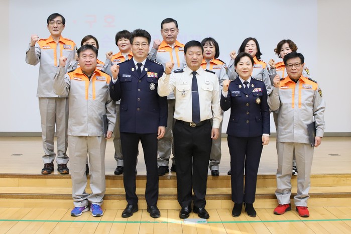 서울 은평소방서는 16일 오후 2시 본서 4층 대강당에서 전통시장 등 재난취약대상 화재예방 및 소방안전관리 강화를 위한 '119기동순찰대 발대식'을 개최했다. 사진은 이창식 서장 및 관계자들이 기념촬영을 하는 모습.(사진제공=은평소방서)