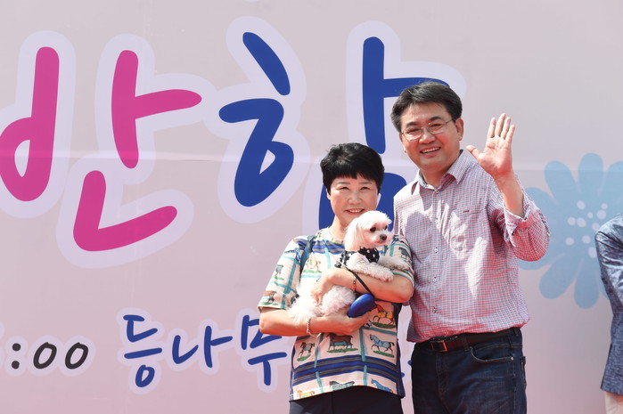 서울 노원구는 최근 중계동 등나무근린공원에서 ‘반려동물 문화 축제: 2019 노원에서 반려동물과 함께!’를 개최했다. 이날 축제는 유기견 입양식, 명랑운동회 등으로 진행됐다. 사진은 오승록 구청장(오른쪽)과 주민이 기념촬영을 하는 모습.(사진제공=노원구청)