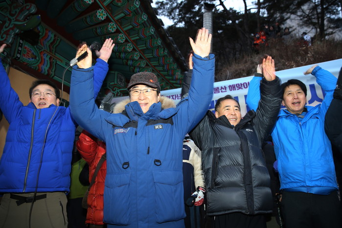 서울 도봉구는 최근 도봉산 천축사에서 새해 첫 일출을 주민 200여명과 함께 구의 발전과 구민 건강을 기원하는 ‘2020년 도봉산 해맞이 행사’를 개최했다. 사진은 이동진 구청장(왼쪽에서 두 번째)과 구민들이 만세삼창을 하는 모습.(사진제공=도봉구청)