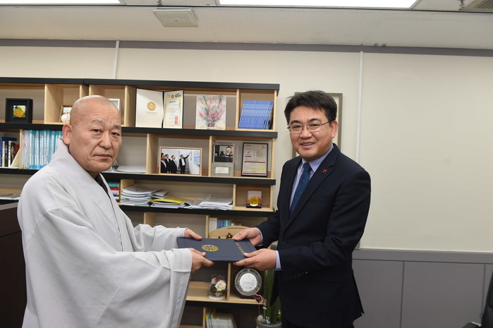 서울 노원구는 최근 구청장실에서 ‘삼각산 도선사 사랑의 성금 전달식’을 개최했다. 이날 삼각산 도선사가 지역내 저소득가구를 위한 성금 1050만원을 전달했다. 사진은 오승록 구청장(오른쪽)이 관계자로부터 성금을 전달받고 있는 모습.(사진제공=노원구청)