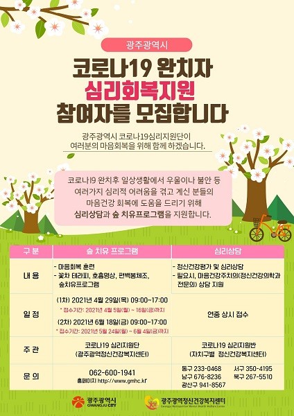 프로그램 참여를 희망하는 코로나19 완치자는 광주광역정신건강복지센터에 문의하거나 홍보 포스터 QR코드 스캔, 광주광역정신건강복지센터 홈페이지 공지사항 해당링크에 접속해 신청하면 된다. 4월 프로그램 접수는 16일까지다.
