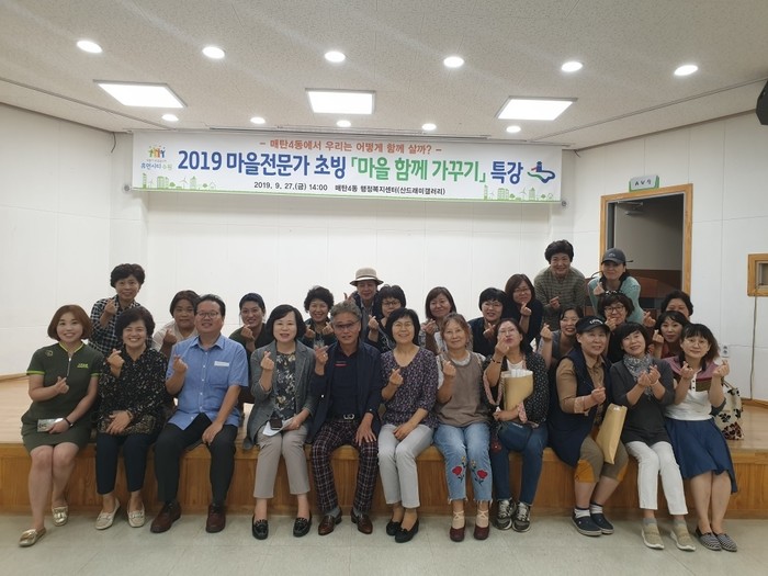 경기 수원시 영통구 매탄4동은 최근 사회적협동조합 '우리동네연구소 퍼즐' 오병철 이사장을 초빙해 ‘마을살이 어떻게 할 것인가?’ 라는 주제로 특강을 실시했다. 사진은 강의가 끝난 후 참여자들이 기념촬영을 하는 모습.(사진제공=영통구청)