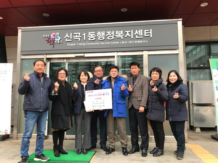 경기 의정부시 신곡1동 주민자치위원회는 26일 100일간 사랑릴레이 배턴 잇기 운동의 일환으로 지역내 어려운 이웃에게 전달해 달라며 성금 110만원을 기탁했다. 사진은 기탁식에 참석한 관계자들이 기념촬영을 하는 모습.(사진제공=의정부시청)