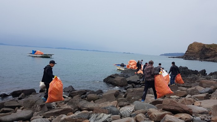 인천 옹진군은 최근 이틀에 걸쳐 특정도서 연평면 구지도 일대에 대한 '2019년 정기순찰 및 환경정화'를 펼쳤다. 이날 공무원 및 주민 등은 이 일대 불법행위 순찰과 함께 쓰레기 약 5톤을 수거해 처리했다. 사진은 쓰레기를 수거하는 모습. (사진제공=옹진군청)