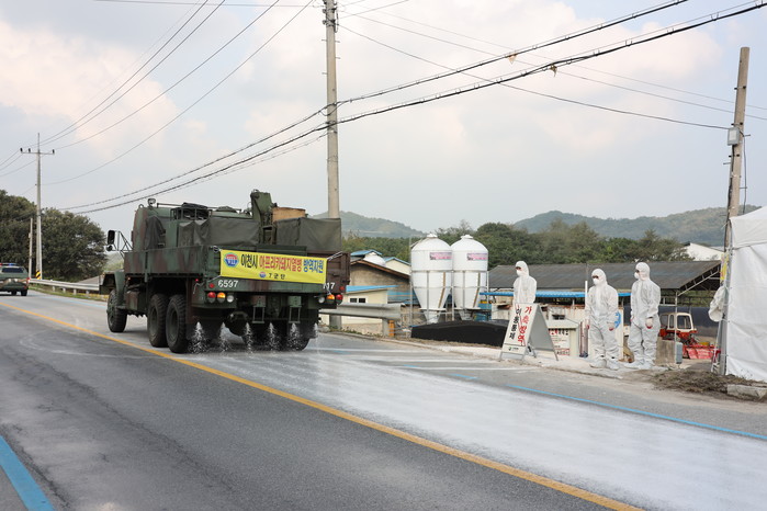 경기 이천시 전역에서 육군 7군단과 항공작전사령부 등이 아프리카돼지열병(ASF) 차단을 위해 제독차를 운영하고 방역작업에 함께 힘쓰고 있다. 또한 병력 200여명을 투입해 방역통제 초소 147곳을 운영하고 있다. 사진은 방역작업을 하는 모습.(사진제공=이천시청)