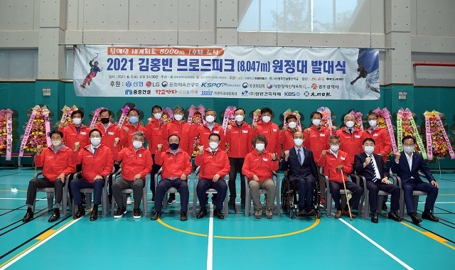 | ▲ 이용섭 광주광역시장(앞줄 좌측부터 5번)이 1일 오후 광주장애인국민체육센터에서 열린 김홍빈 브로드피크 원정대 발대식에 참석하여 참석자들과 함께 등반성공을 위한 기념촬영을 하고 있다. /광주광역시 제공 |
